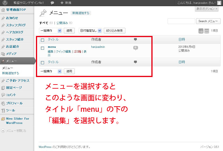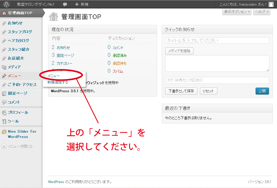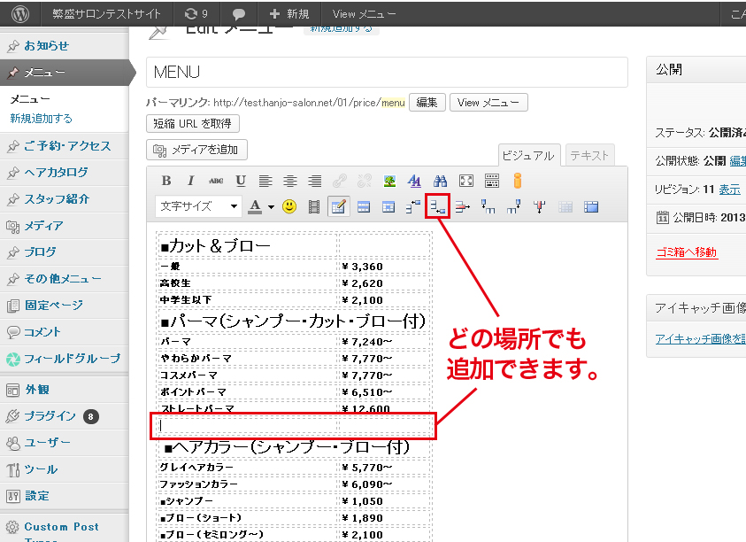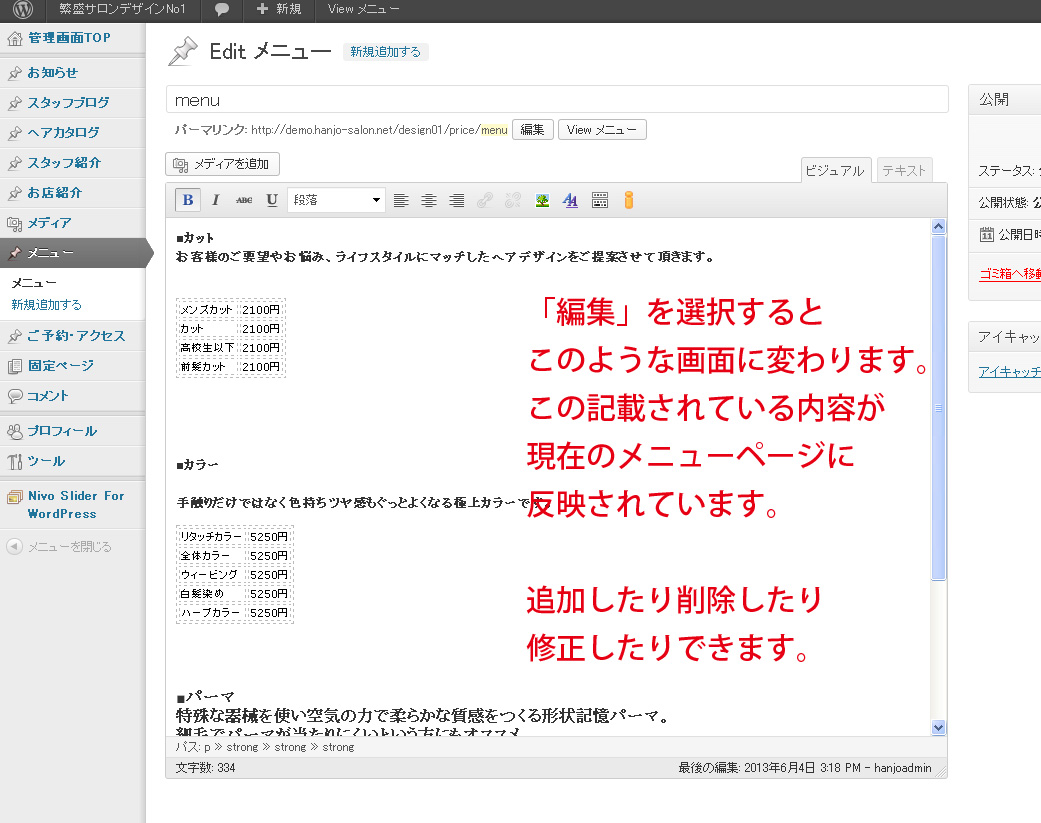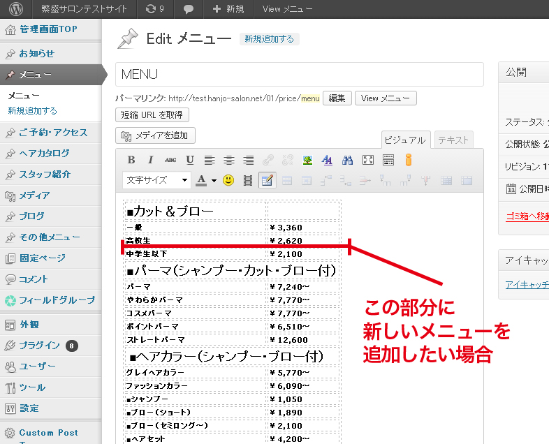 メニューを追加・修正したい!! 投稿日: 2013年11月1日 / カテゴリー:メニューページの更新, 文字入力・画像について メニューを追加や修正したい場合は以下のように行います。画像をクリックすると拡大します。 「新規追加」という項目は無視してください。 「新規追加」で記事を書いても反映されません。 コメントを残す コメントをキャンセルメールアドレスが公開されることはありません。 * が付いている欄は必須項目ですコメント 名前 * メール * サイト 次回のコメントで使用するためブラウザーに自分の名前、メールアドレス、サイトを保存する。