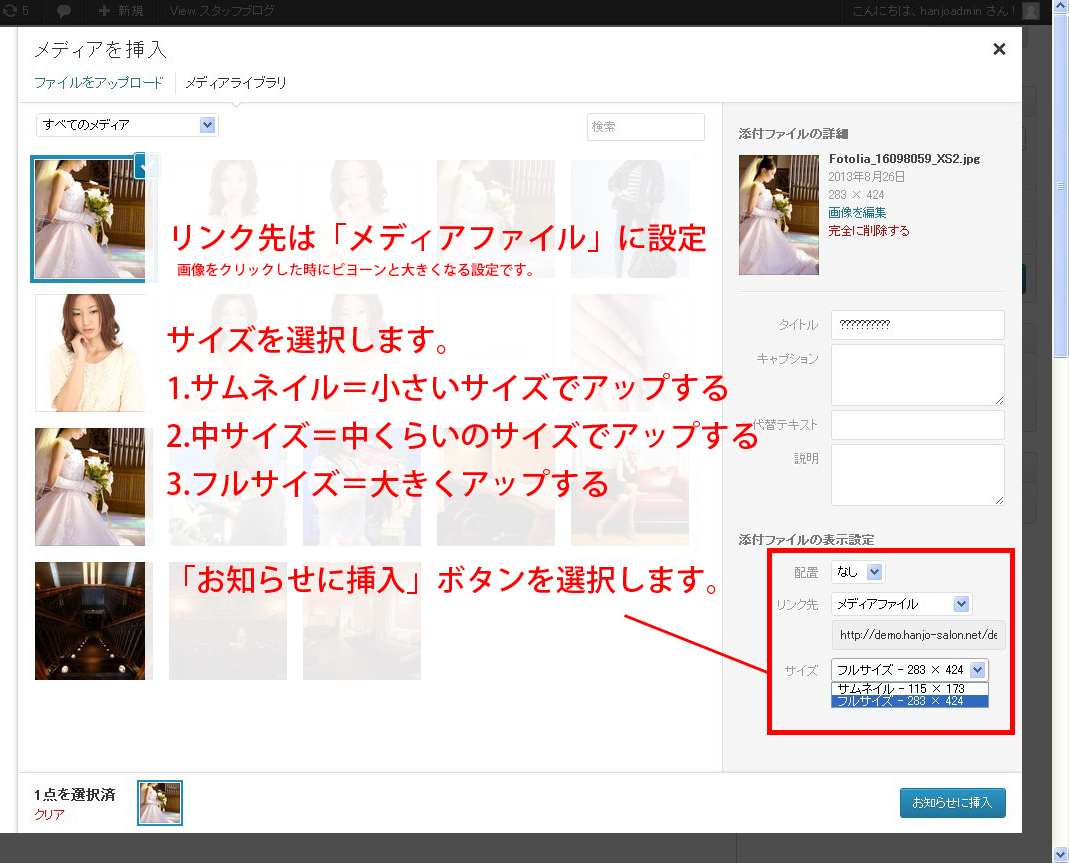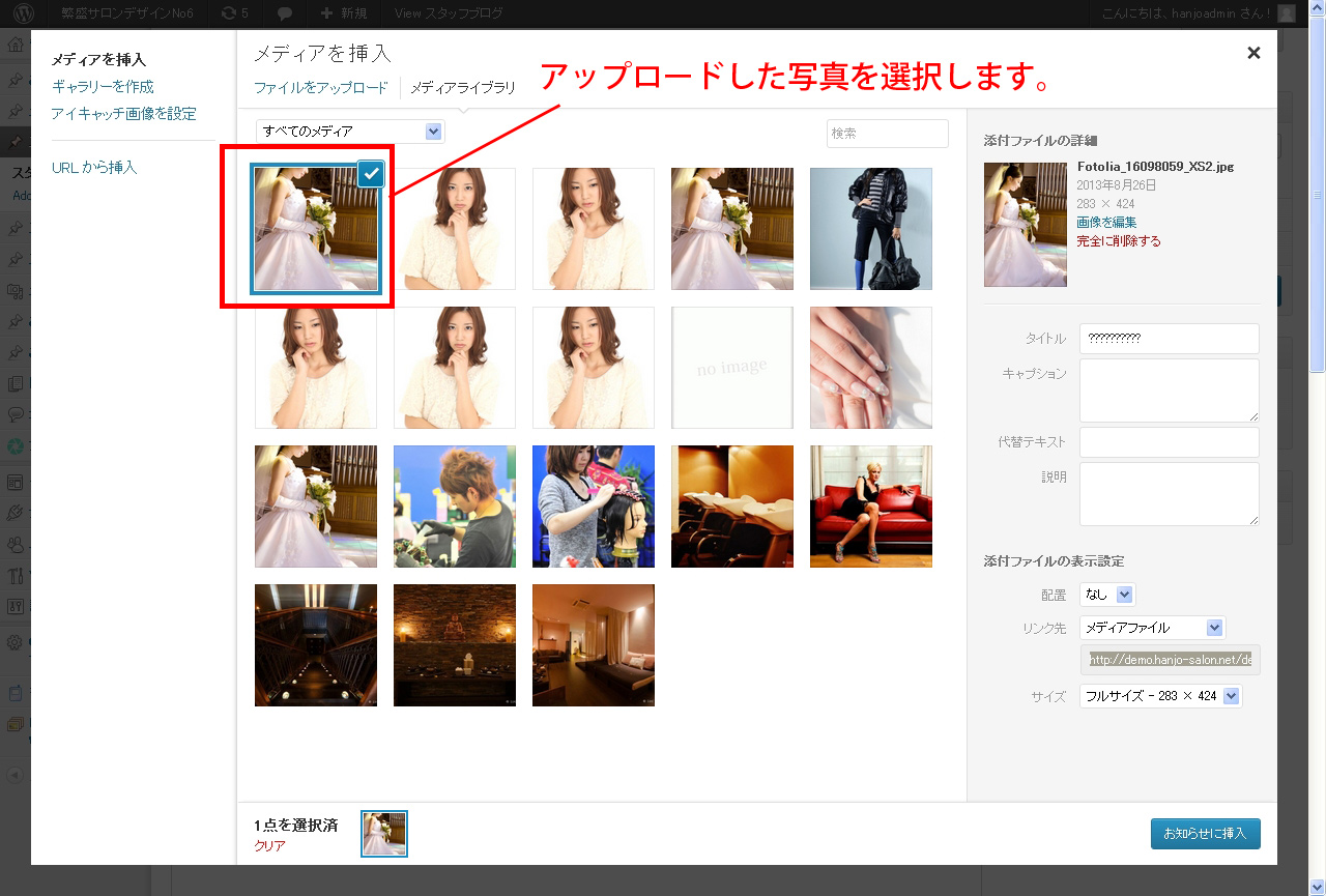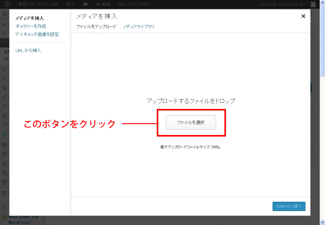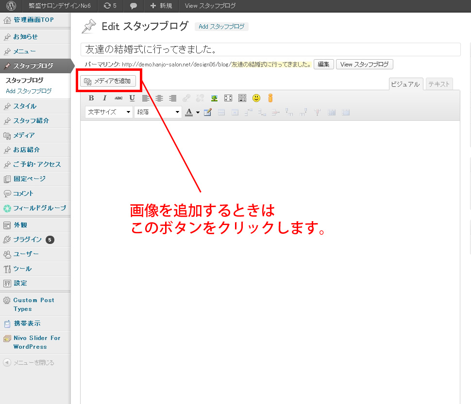 まずタイトルの部分の下にある「メディアを追加」というボタンをクリックします。